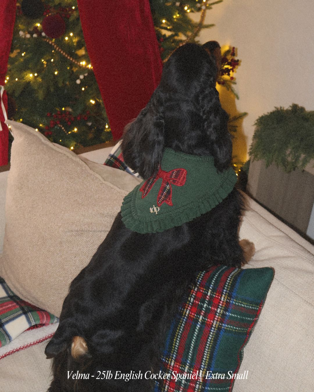 Meet the Kensington Bow Bandana: Rich everest green, a traditional red tartan bow, and timeless holiday styling inspired by fireside gatherings and classic Christmas heirlooms. Effortlessly polished in either Ruffled or Classic finishes. Features our exclusive DeluxeFIT design - finished with a ribbed knit border, curved neckline, snaps, and a luxe die-cut gold tag for a look that’s uniquely TDP.