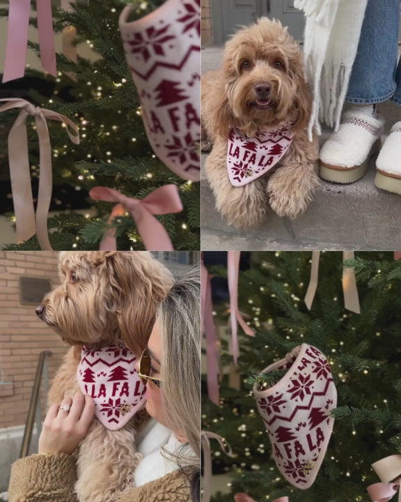For the slopes or the aprés. The TDP FA LA LA Bandana is a pink and red Fair Isle Bandana adorned with timeless holiday symbols. Features our exclusive DeluxeFIT design - finished with a ribbed knit border, curved neckline, snaps, and a luxe die-cut gold tag for a look that’s uniquely TDP.